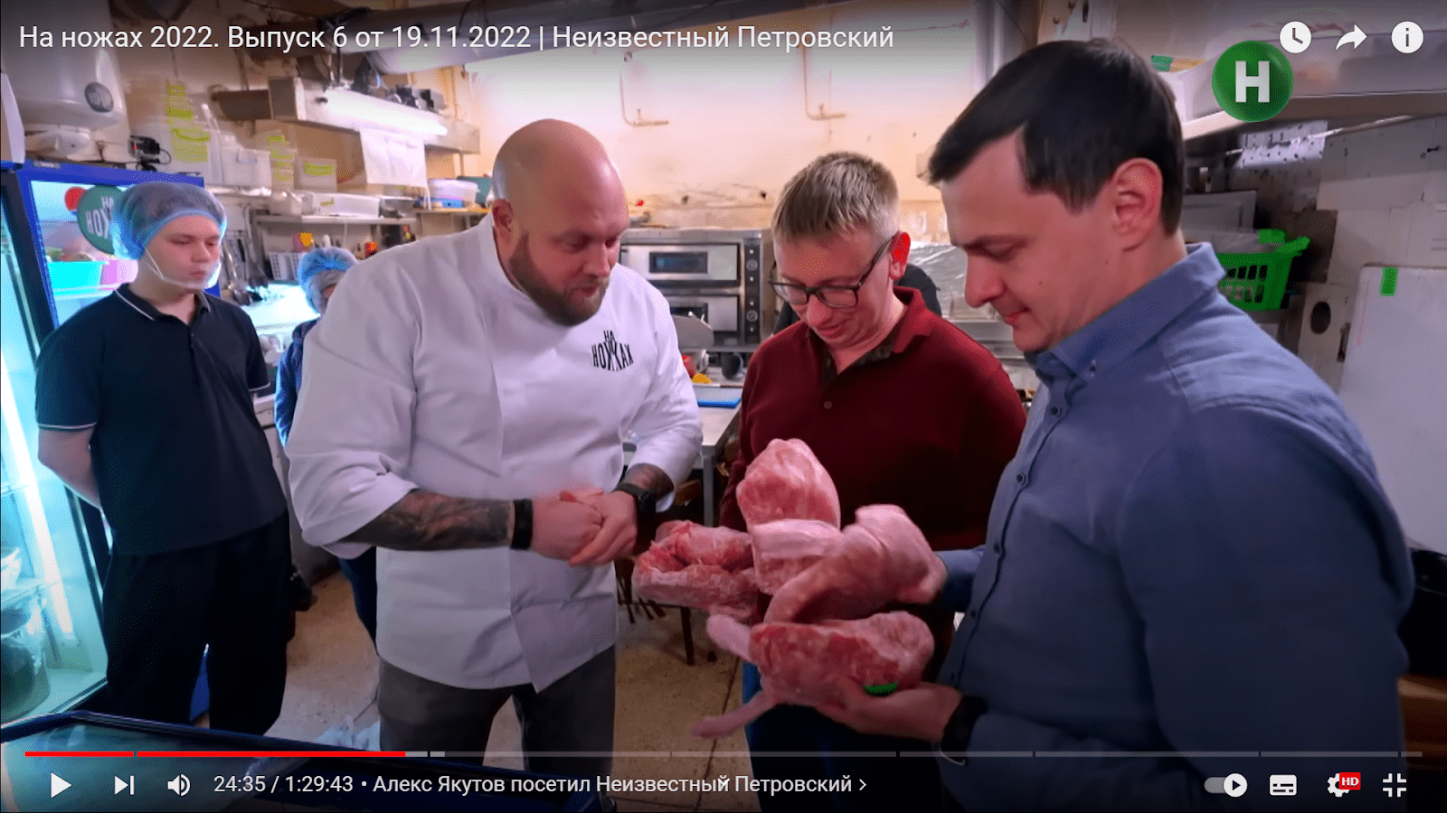 На кухне ведущий увидел, что не все повара работают в кителях. Кухня – грязная. Все мясо заморожено,а в морозилке лежит килограмм десять никому не нужного замороженного фарша.