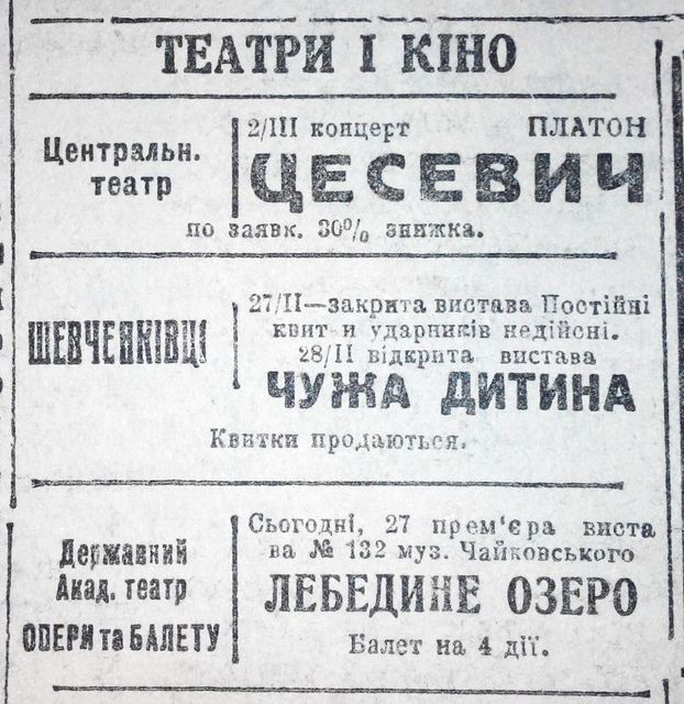 В 30-е годы реклама в местных газетах была для самых требовательных жителей города. К примеру, в театральных журналах публиковали рецензии на спектакли, анонсы театральных показов. 2 марта 1934 года в Центральном театре состоится спектакль «Цесевич». По заявке предлагали скидку на билеты 30%. Также печатали рекламу премьеры представлений.