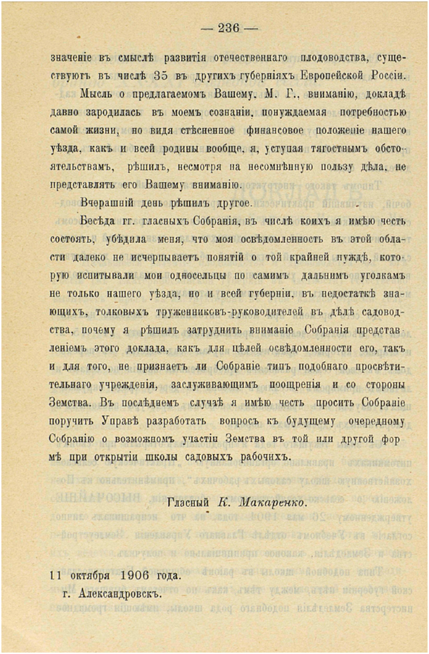 После выступления на заседании уездного земского собрания земского гласного Александровского уезда Макаренко дело понемногу сдвинулось с места. Ведь разработанный проект – это уже конкретные действия, нужно только сориентироваться, с какой стороны браться за решение проблем. Подготовку выпускников Екатеринославской школы садоводства присутствующие участники собрания раскритиковали и отметили, что необходимо создать отдельную профессионально-техническую образовательную ячейку для подготовки рабочих по садоводству. Что касается практической школы садоводов, то готовность гласного Макаренко предоставить территорию собственного имения решала немало организационных вопросов.