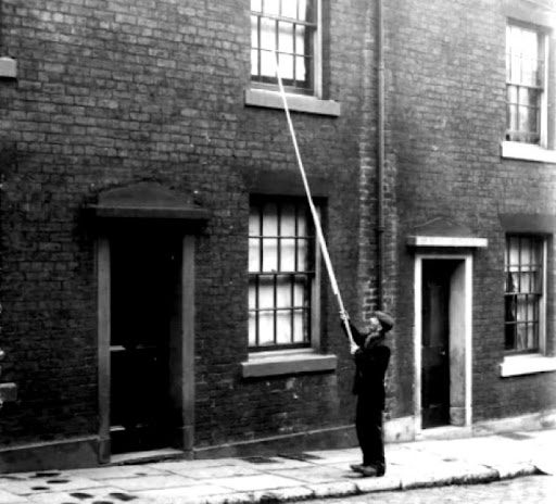 - Человек-будильник. Такая интересная профессия была популярна в Великобритании во время промышленной революции. «Человек-будильник» стучал в окна работников, чтобы те просыпались вовремя. Помогала ему палка или камешек.