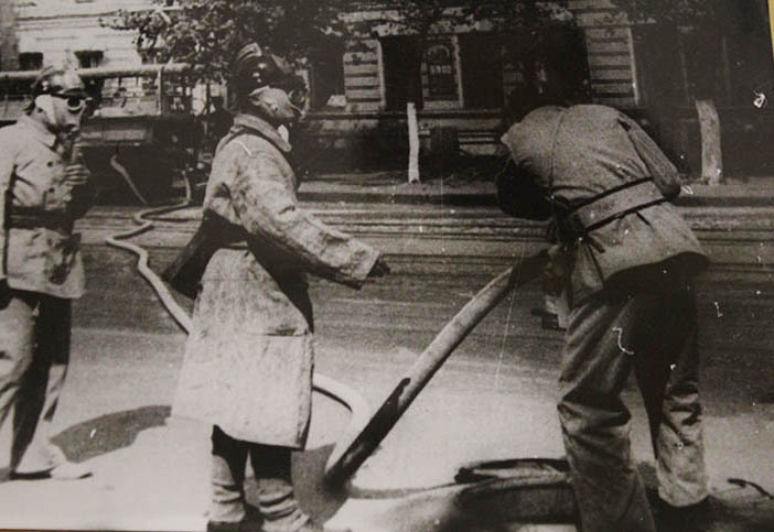 На одній зі світлин 1930-х років видно, як газодимозахисна служба проводила навчання у Дніпрі. До речі, більшість чомусь вважає, що перші пожежники обов’язково носили бороди. Вони припустили, що борода захищала вогнеборців від диму. Хоча деякі стверджували, що пожежникам було просто ніколи голитися, що цілком ймовірно. Ну а з появою газодимозахисної служби з ними довелося розпрощатися, бо протигаз натягнути на бороду стало проблематично.